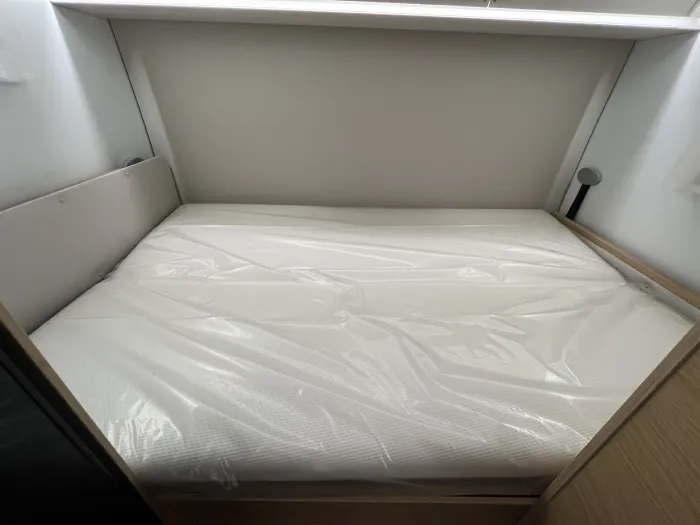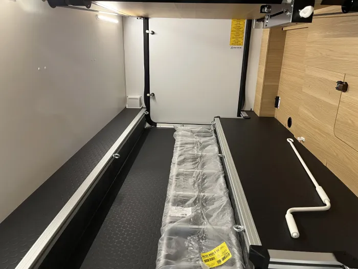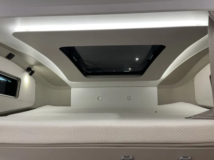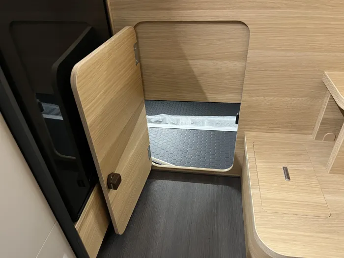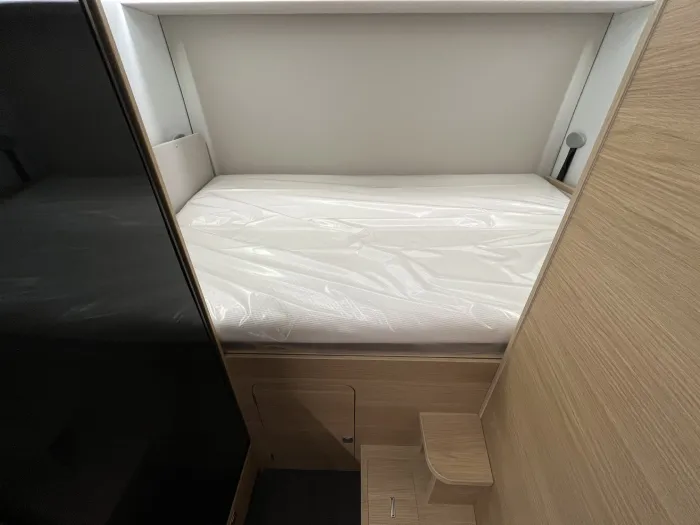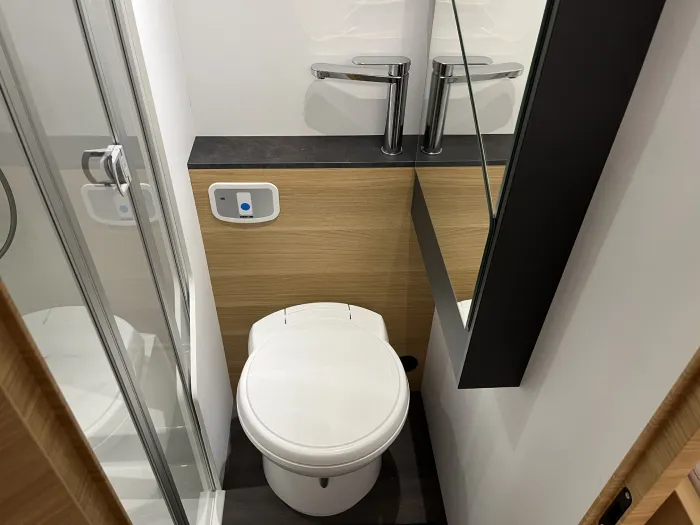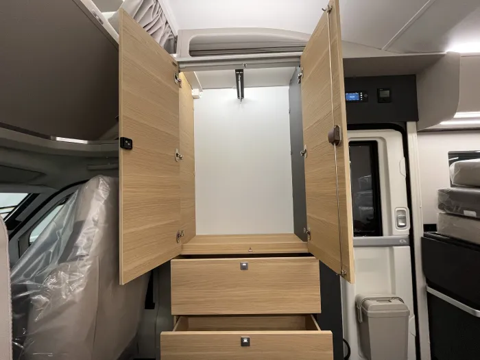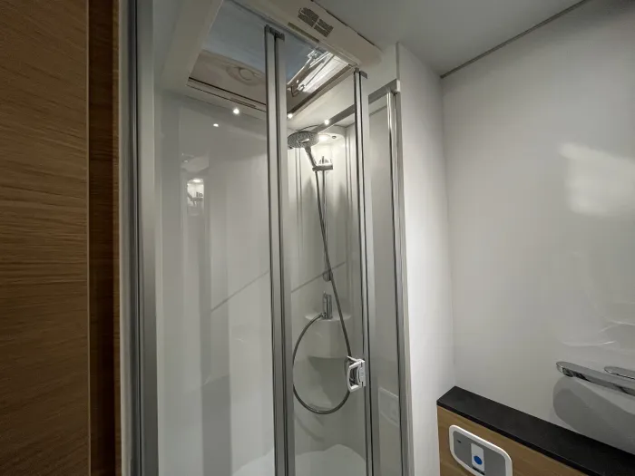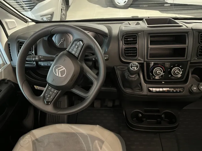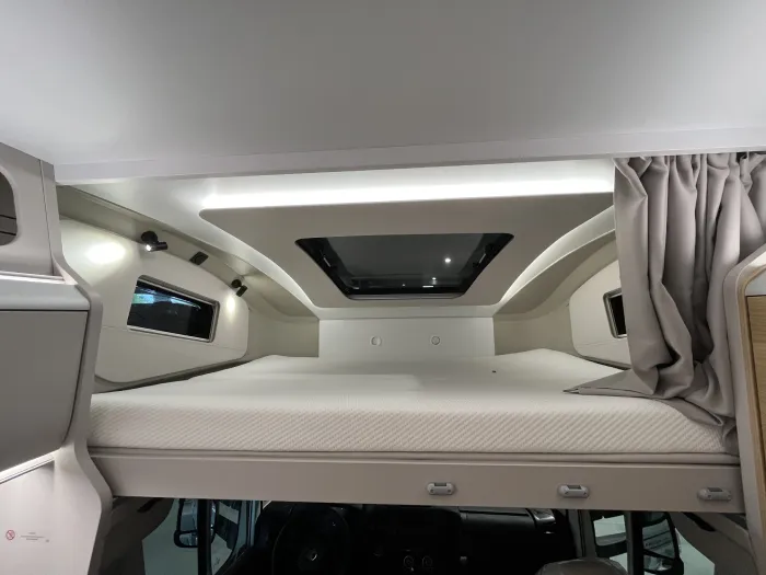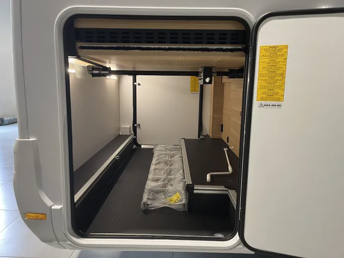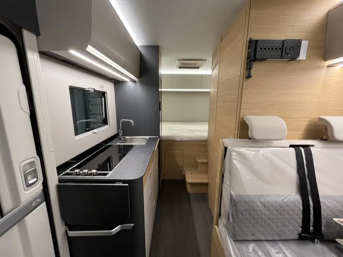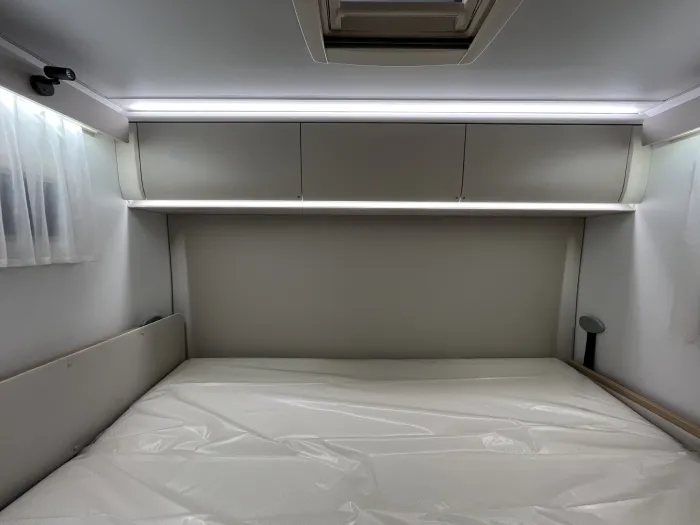 En la zona de descanso, dispone de una cama transversal de 210 x 140 cm con armarios altillos, además de una amplia cama capuchina de las mismas dimensiones, ideal para maximizar la capacidad sin sacrificar confort. El baño es completo y cuenta con ducha integrada, ofreciendo funcionalidad en un espacio compacto.