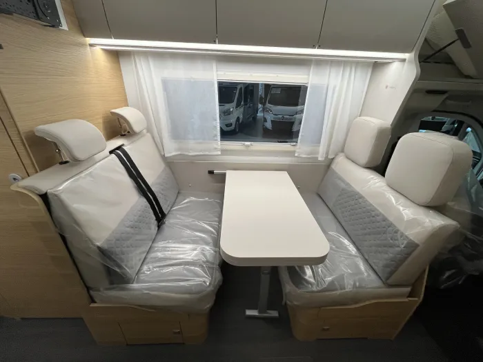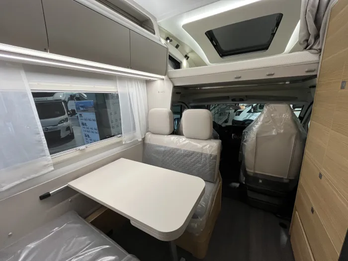 Su distribución está pensada para aprovechar al máximo cada rincón. En la zona delantera encontramos un amplio salón tipo face to face, muy luminoso y fácilmente convertible en una cómoda cama doble, además de contar con abundante espacio de almacenamiento.