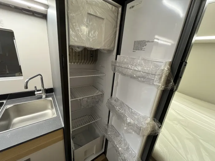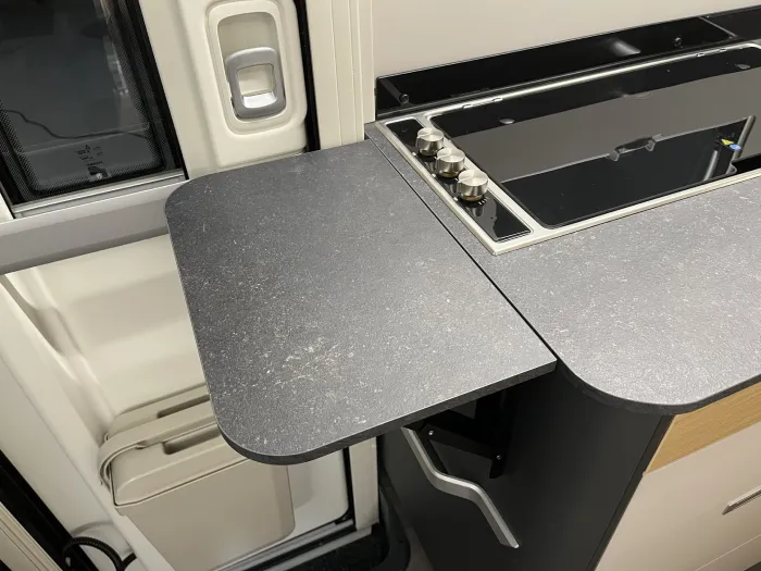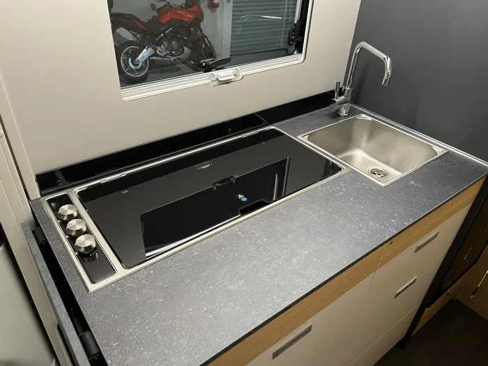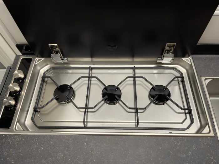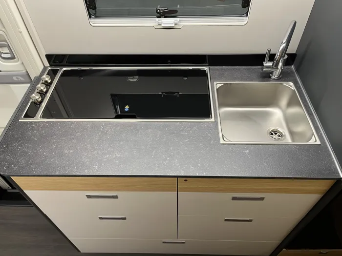 La cocina, completamente equipada, incluye dos fogones, fregadero, extensión de encimera, múltiples armarios y cajones, así como un frigorífico de 142 litros, perfecto para viajes largos.