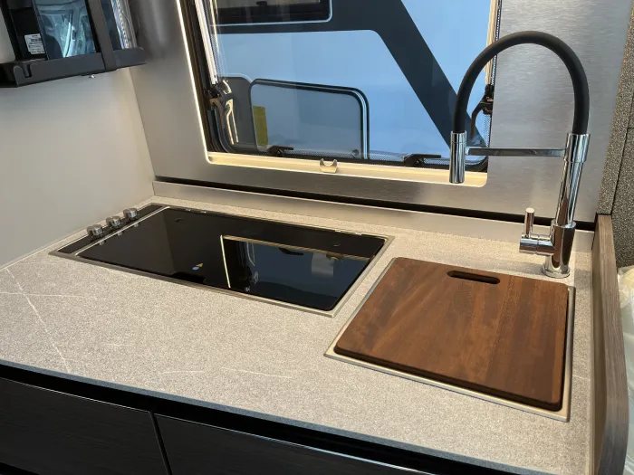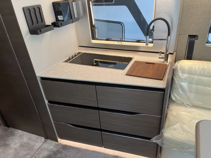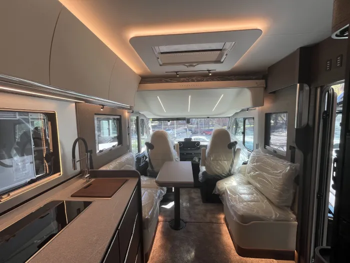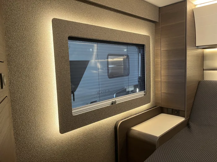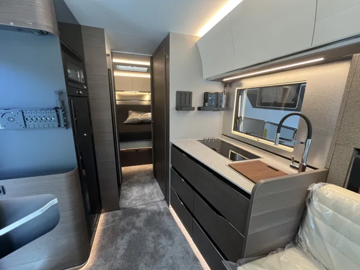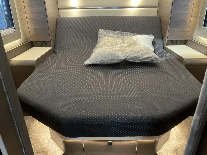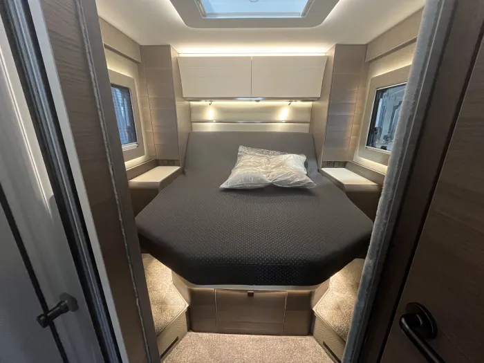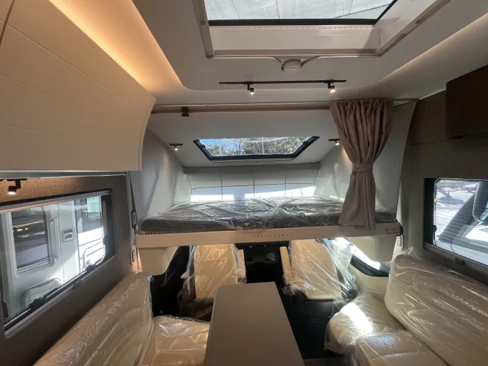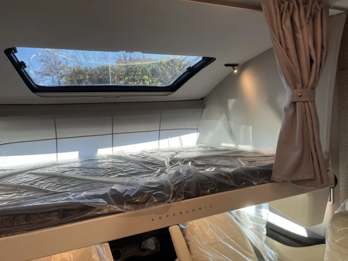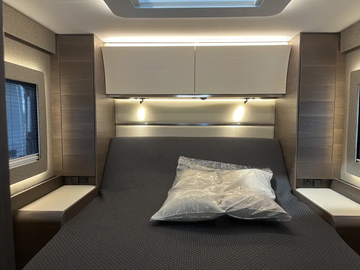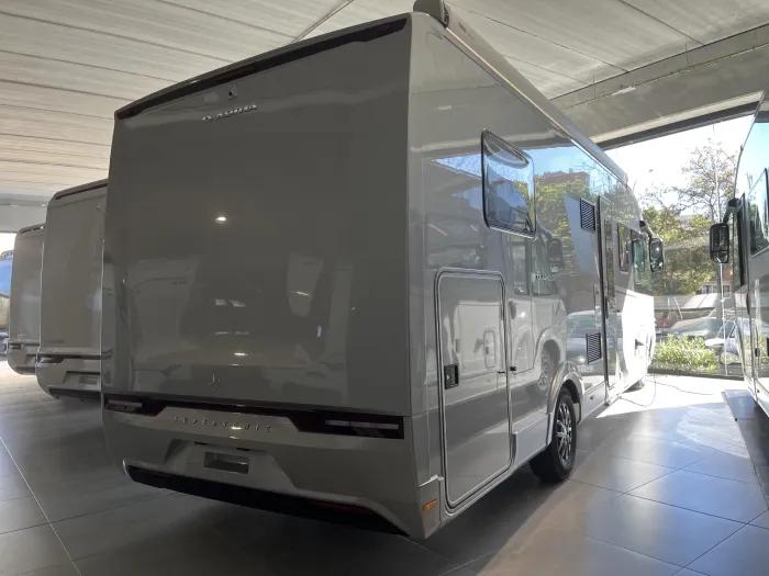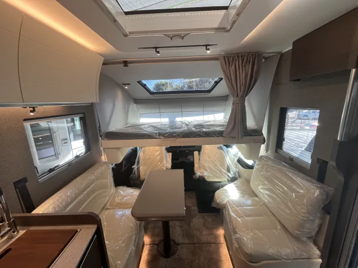 La Autocaravana Super Sonic 780 DC proporciona un entorno inspirado en el diseño de yates y viviendas actuales. El salón dispone de asientos alineados que ofrecen un espacio extenso y cómodo para descansar. La cocina cuenta con equipos de cocina de primera calidad, entre ellos un frigorífico de 177 litros. El dormitorio principal cuenta con una cama central en la parte trasera, junto con una cama eléctrica abatible en la parte frontal, lo que permite alojar hasta cuatro personas de manera cómoda.