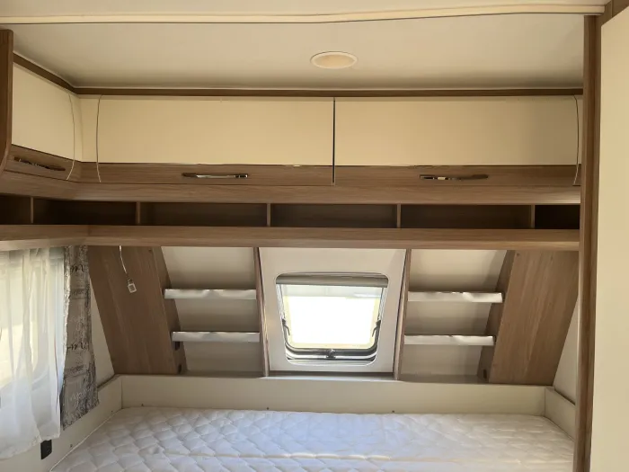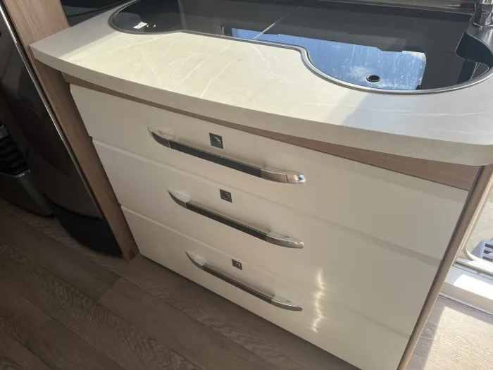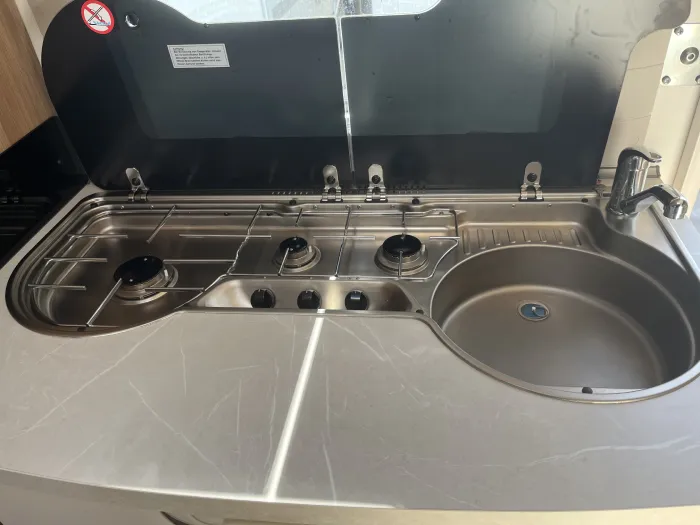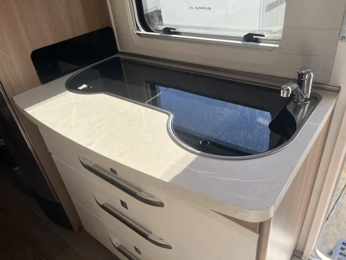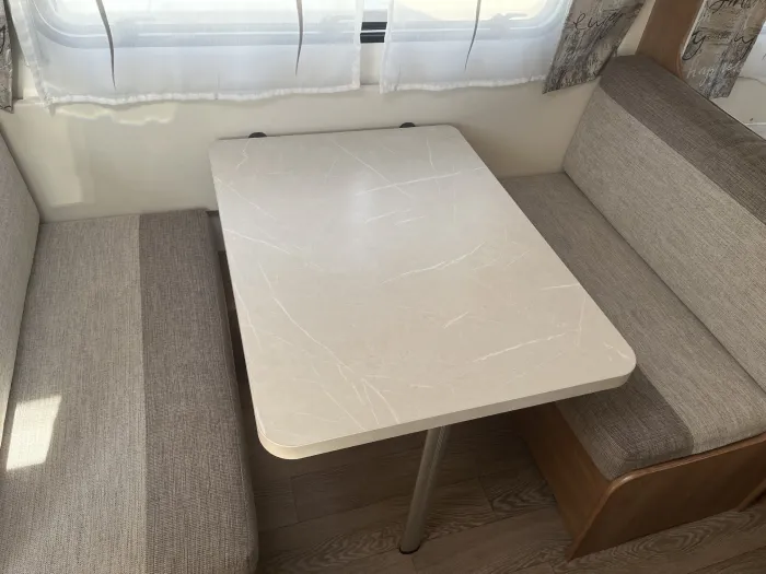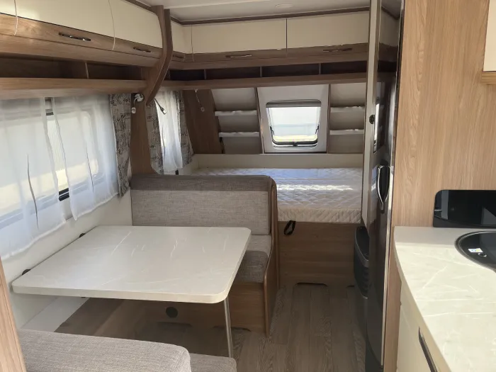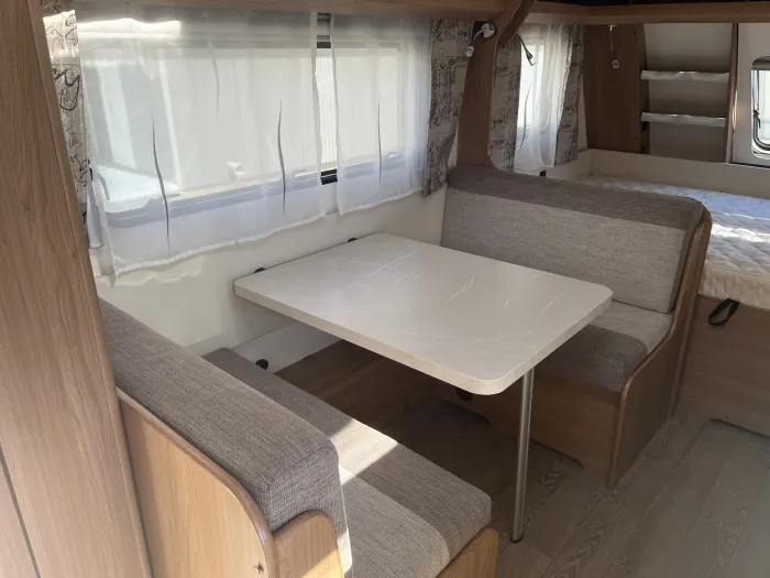Esta caravana dispone de una cocina totalmente equipada con fogones, fregadero, múltiples compartimentos de almacenamiento y un frigorífico compresor de 150 L perfecto para viajes largos. El interior ofrece un salón “face to face” amplio y cómodo, un baño completo con plato de ducha, calefacción Truma y unos acabados modernos y elegantes que crean un ambiente acogedor y de calidad superior.