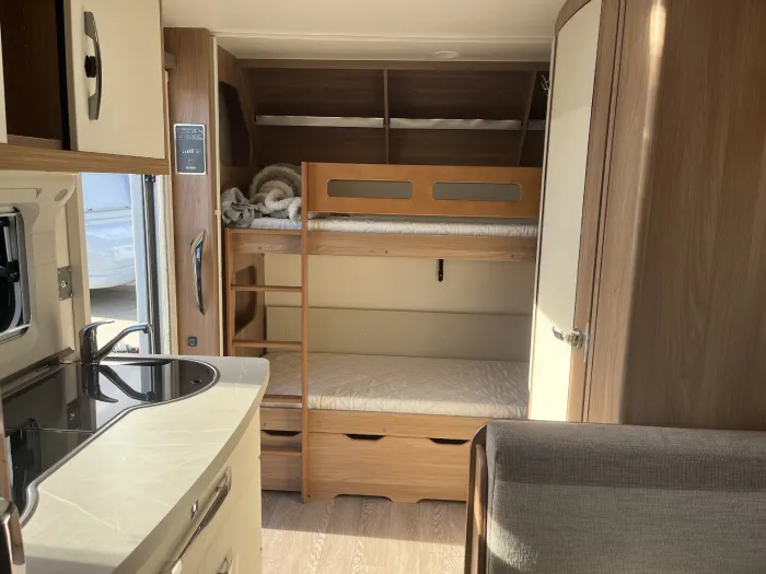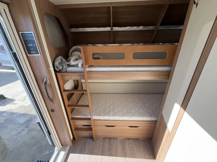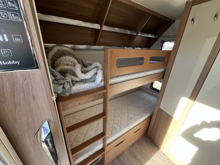 La Hobby 490 KMF De Luxe es una caravana ideal para familias, con capacidad para 4+1 personas y una distribución que consiste en: dos literas, cama transversal y un salón convertible en cama individual que permite aprovechar al máximo cada espacio.